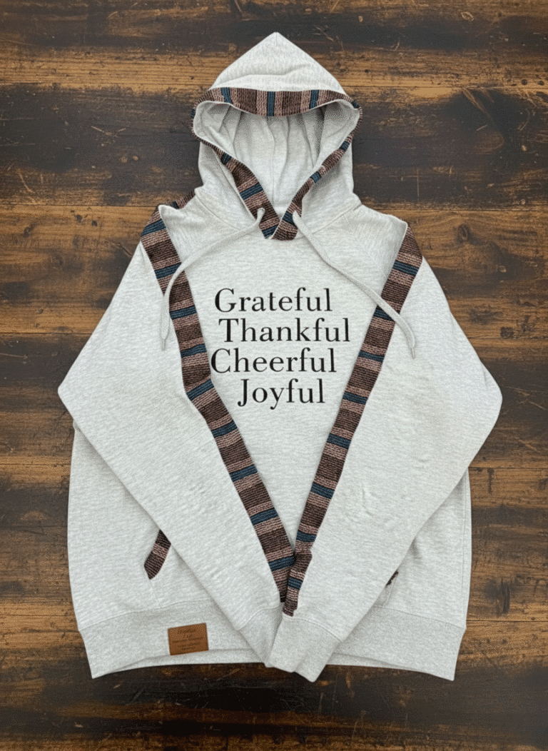 Wrap yourself in the soft, breathable comfort of 100% cotton with our signature "Grateful, Thankful, Cheerful, Joyful" hoodie. This hoodie is designed for all-day wear, offering a cozy yet light feel.